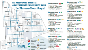 La Corporation de développement communautaire Action Solidarité Grand Plateau (CDC ASGP), en collaboration avec la Société de développement de l’avenue Mont-Royal, du poste de quartier 38 et des ressources du milieu, a élaboré une carte des ressources offertes aux personnes en difficulté dans le secteur du Plateau Mont-Royal.