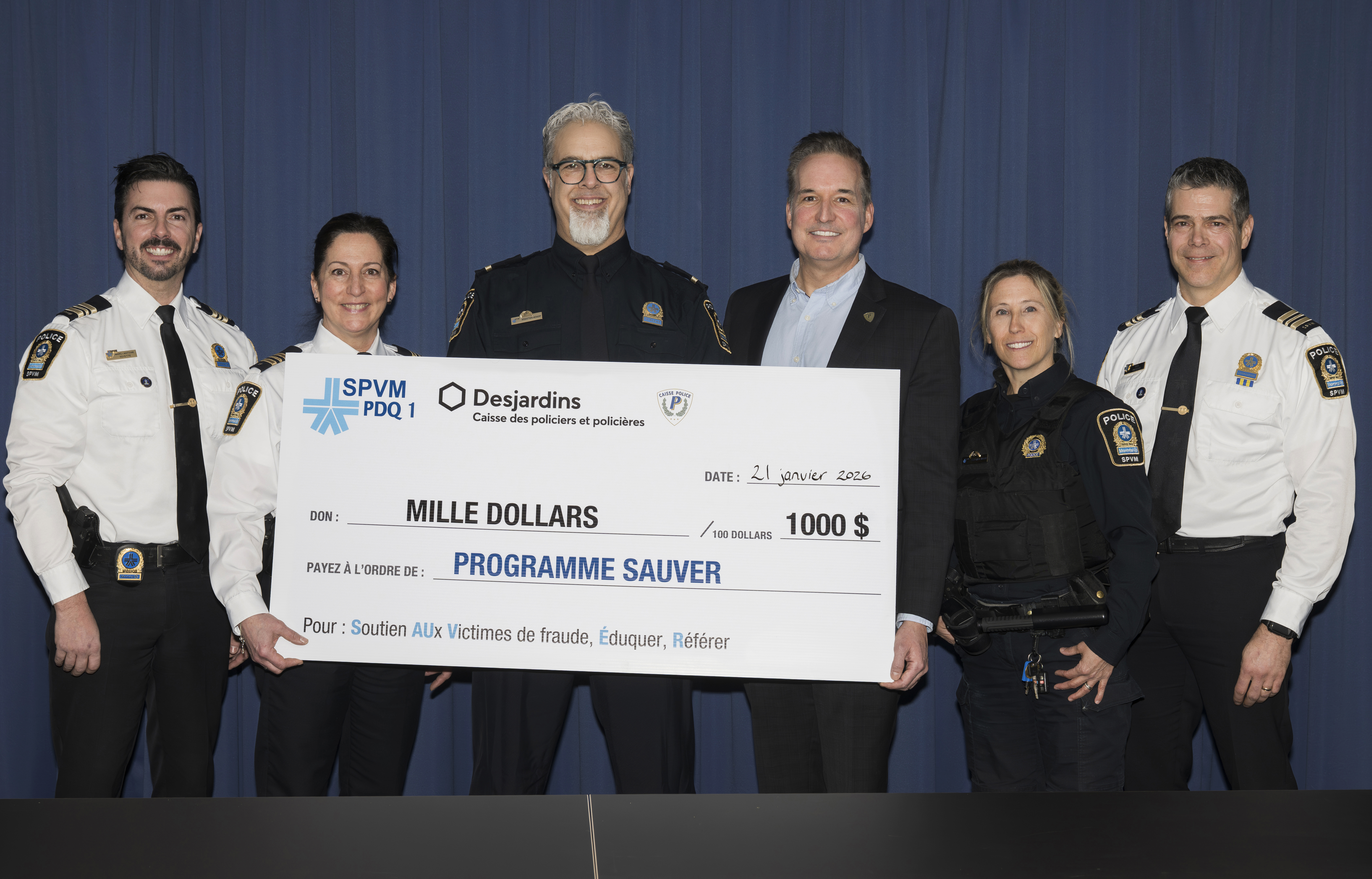 Le Service de police de la Ville de Montréal (SPVM) remercie la Caisse Desjardins des policiers et des policières pour sa contribution à SAUVER, le programme Soutien aux victimes de fraude, éduquer et référer. La remise officielle du chèque a eu lieu le 21 janvier dernier. SAUVER offre un accompagnement personnalisé aux personnes en situation de vulnérabilité ayant été victimes de fraude, notamment les arnaques de type « amoureuse » ou « grands-parents ».